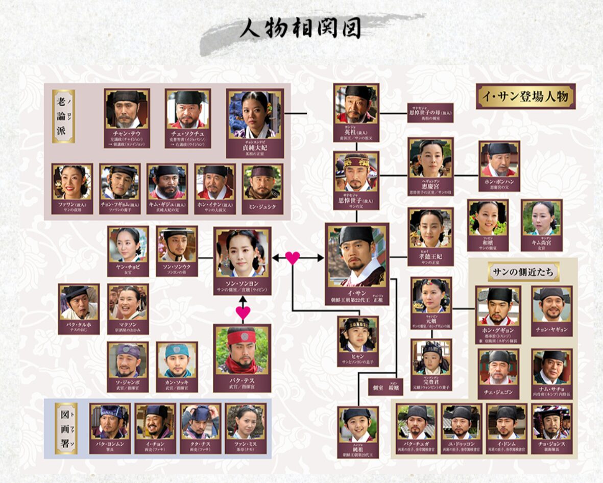 | 英祖(ヨンジョ) | サンの祖父(第21代国王) | 味方(中盤) | 息子(思悼世子)を死なせたが、孫のサンに王位を譲る。物語中盤で死去。 |