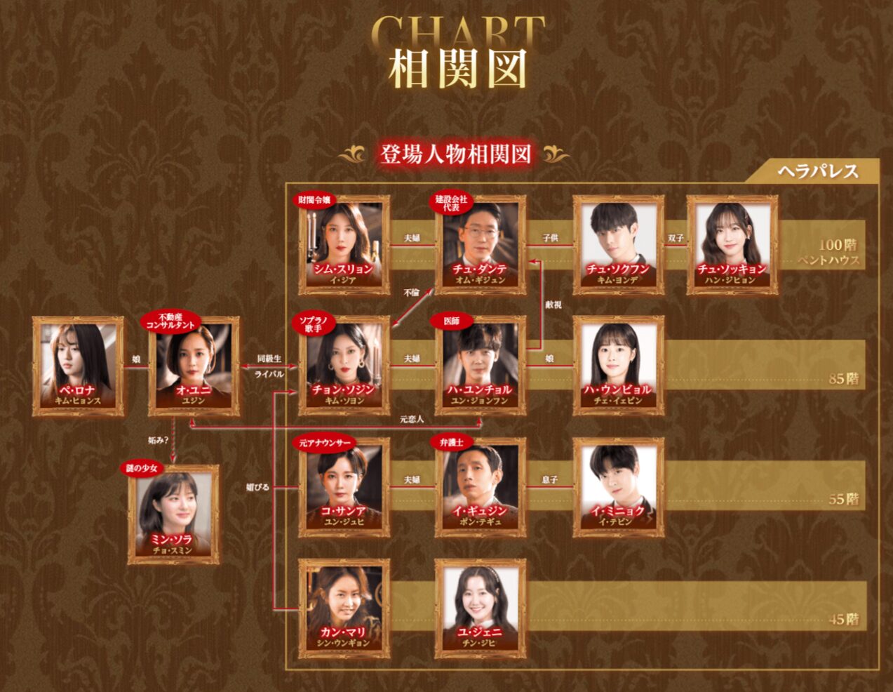 - ヘラパレスの権力構造 最上階のスリョン&ダンテ夫妻が頂点に君臨。その下にソジン&ユンチョル夫妻、ギュジン&サンア夫妻、カン・マリ一家が続きます。