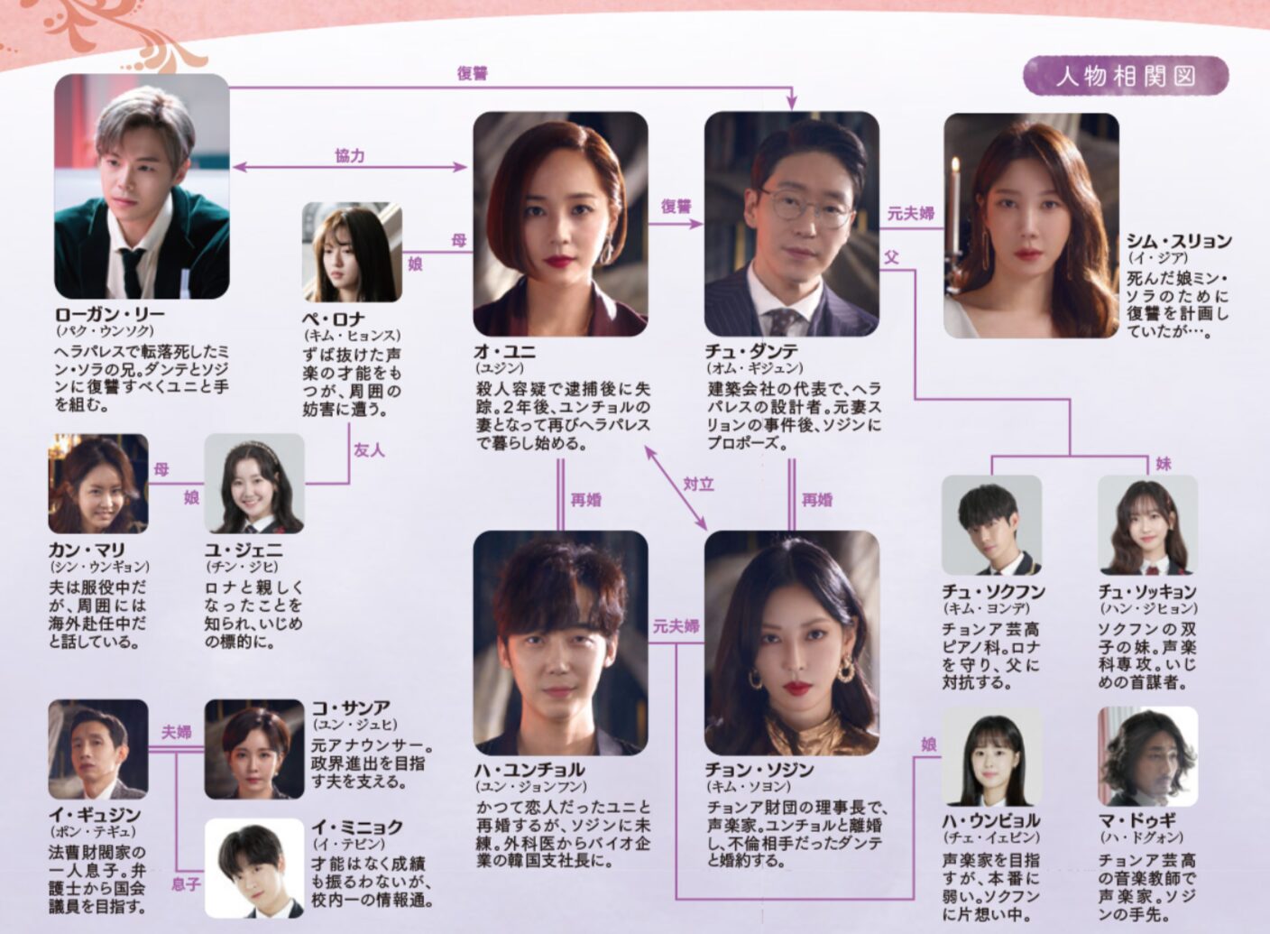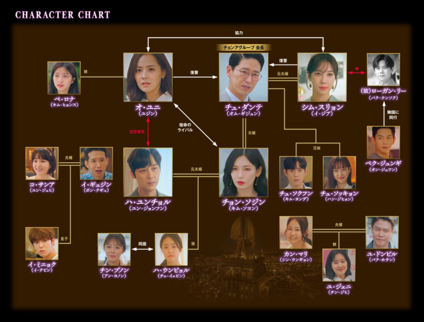 転落死したミン・ソラが、実は自分の実の娘(チュ・ダンテによって病院ですり替えられ、養護施設に送られていた)だと知ったスリョンは、ダンテとヘラパレスの住人全員への復讐を水面下で計画していました。その協力者が、ミン・ソラの義兄(養子)であったローガン・リーだったのです。